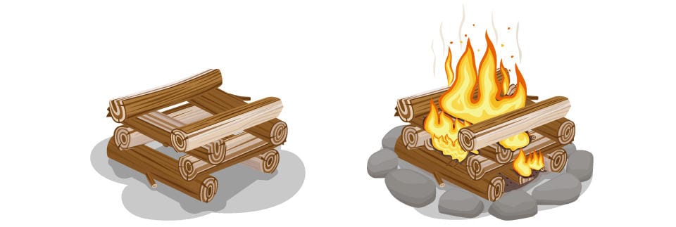 The best way to start a fire in a wood-burning fireplace is by building a “log cabin fire.” This method allows the flames from the fire starter to burn up through the center, rapidly heating your flue pipe to create a natural draw as soon as possible, reducing the possibility of smoke ingress into the room.